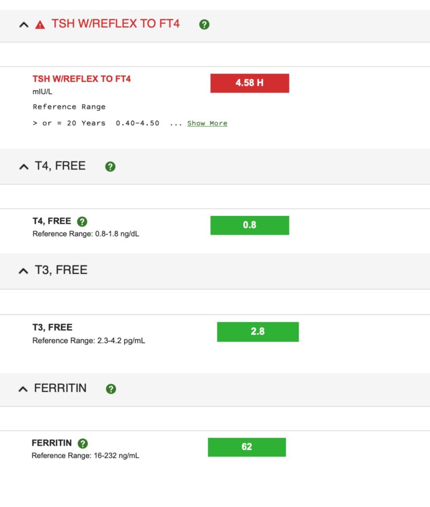 The problem with only looking at TSH is that TSH is a hormone that comes from the brain to trigger the thyroid to release its hormones (T4 is inactive and T3 is active). However, it does not tell us whether the thyroid is actually releasing these hormones and if they are adequate. For that we need to see free T4 and T3 levels, as well as reverse T3.